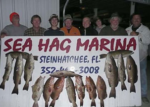 In spite of the unusually warm weather early in the month, the fishing has been excellent at Steinhatchee this January. Inshore, trout and redfish were available on the flats early, and were caught on just about everything thrown at them. Redfish were unusually common, found both on the flats in schools and also in some of the larger creeks. The grouper bite was consistent throughout the month, with the larger fish being found in slightly deeper water than usual, probably because of the higher water temperatures. However, when the major cold front paid us a visit in the third week, with morning air temperatures in the 20's, the picture changed. Inshore, the trout came into the river in excellent numbers, with boats right behind them, as you can see from the picture below. Limits were easily accessible, with the best fishing coming with live shrimp, Gulp-tipped jigs, or 52M Mirrolures fished slowly in the middle of the water column. At the same time, some of the larger trout began schooling in warmer locations near and inside of creeks. I've included a few inshore shots from this month.