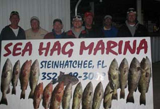 But the major attraction this month will be sheepshead. They have already been spotted on the flats, they're being caught in the river, and males have been seen on the Steinhatchee reef. When the spawning aggregations gather, so do the boats on the reef. Get there early, have live shrimp or fiddler crabs, and fish with a soft touch, because sheepshead can be a challenge because of their soft bite. The old joke is that you have to set the hook before you feel the bite. Calm seas make feeling the bite easier, but with light tackle you can easily bring home lots of tasty filets. For tackle, braided line has a great advantage over mono in terms of feeling every little tap. Redfish and trout rods work fine for most fish, although the ten pounders will give you a tussle. You can use either a standard fish-finder rig, or many experienced veterans use a ½ oz widegap jighead on a fluorocarbon leader, with no additional weight, as it provides a more direct connection and improves bite detection. There is a 15 fish limit, and each fish must be over 12 inches in length. Even though the amount of meat per fish is relatively low, please keep only a reasonable number of fish, as they are in spawning mode.
