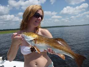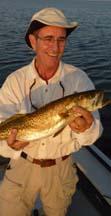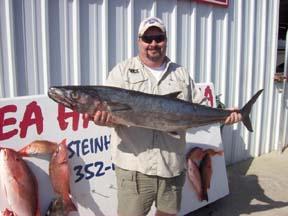 With the end of scallop season, the fishing has gradually improved through the month, both offshore and inshore. The last week of the month finally saw some overnight temperatures into the low 60's which was just what was needed to activate the fishery. Bountiful schools of baitfish have been moving into town, including mullet of all sizes, whitebait from tiny to large pogies, glass minnows (rainbait)--even ballyhoo. The Spanish mackerel bite has been excellent, and the kingfish have arrived in our area. I had several good trips this month. Early in the month Doug Barrett and I found some nice early trout, anchored by this 4 pounder taken on a topwater plug. Near the middle part of the month, the temperatures shot up again and the fishing suffered, but Annie Snyder found this nice redfish near a marshline. And at the end of the month, a weekend exploration with Capt. Tommy Thompson found some excellent redfish and trout south of Pepperfish Keys.