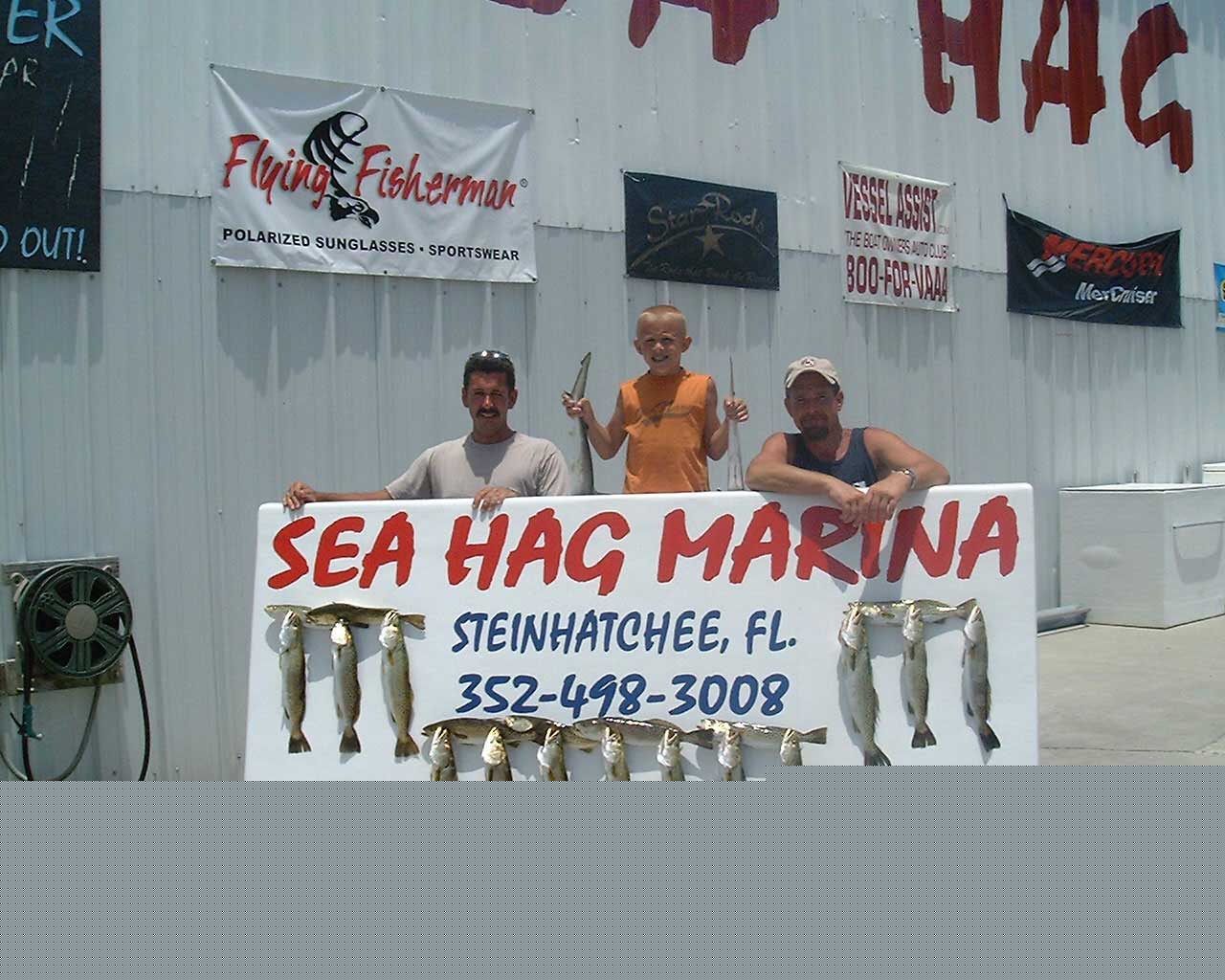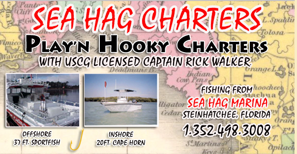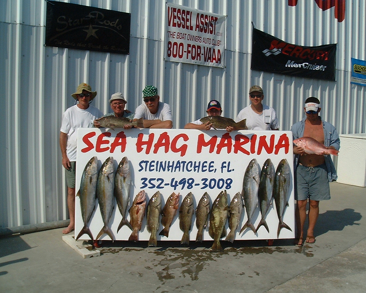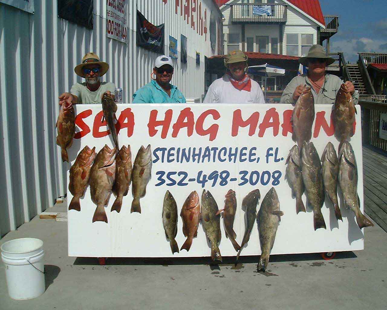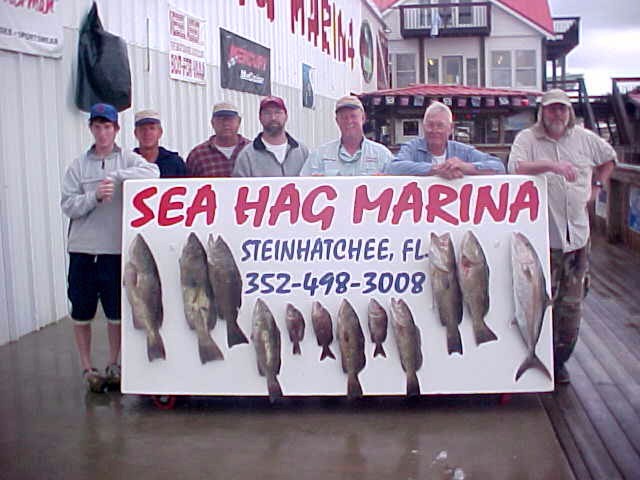 We're back! I'm Captain Rick Walker and it's my turn to try my hand at the fishing reports for a while. Danielle has filled my jump drive with pictures she has taken over the past year so I'll get some presented with this post. Sorry I won't be able to match names with the pictures (unless you email them to me). Captain Walt Carlson reports that some are having good luck catching and releasing sea trout. Many trout over 24" are being caught and released. As you know; next week you can keep them again! Trout are being caught using live shrimp and still others are using lead head & plastic tails along with some suspending lures. I am also getting reports of a few Sheepshead being caught on the Steinhatchee Reef. Although grouper have slowed down; with the water temperature offshore in the 58-60 degree range, good catches are still coming in. I took Garrett, Melvin, Derek (Sea Hag Marina Employees) and their guest on a "thanks for the great job you do" trip Monday the 21st. We fished on "Miss Chaeli" our Sea Hag Charter boat. Seas were 5 to 7 foot well offshore with an occasional light rain. First stop was at the Springs for some great Amberjack action. Our next destination was 6 miles away to find some new numbers while trolling. We picked up 3 nice grouper in the 12 pound range using Stretch 30's and came back with some new numbers. Lots of short grouper, Florida snapper and black sea bass were caught bottom fishing. Everyone had a great time and we were back at the dock at 5:00. See the picture below/right for some of the catch. You can e-mail me with your tips, comments and questions at askcaptain@seahag.com .Take a kid fishing and hope to see you on the water soon. Capt. Rick