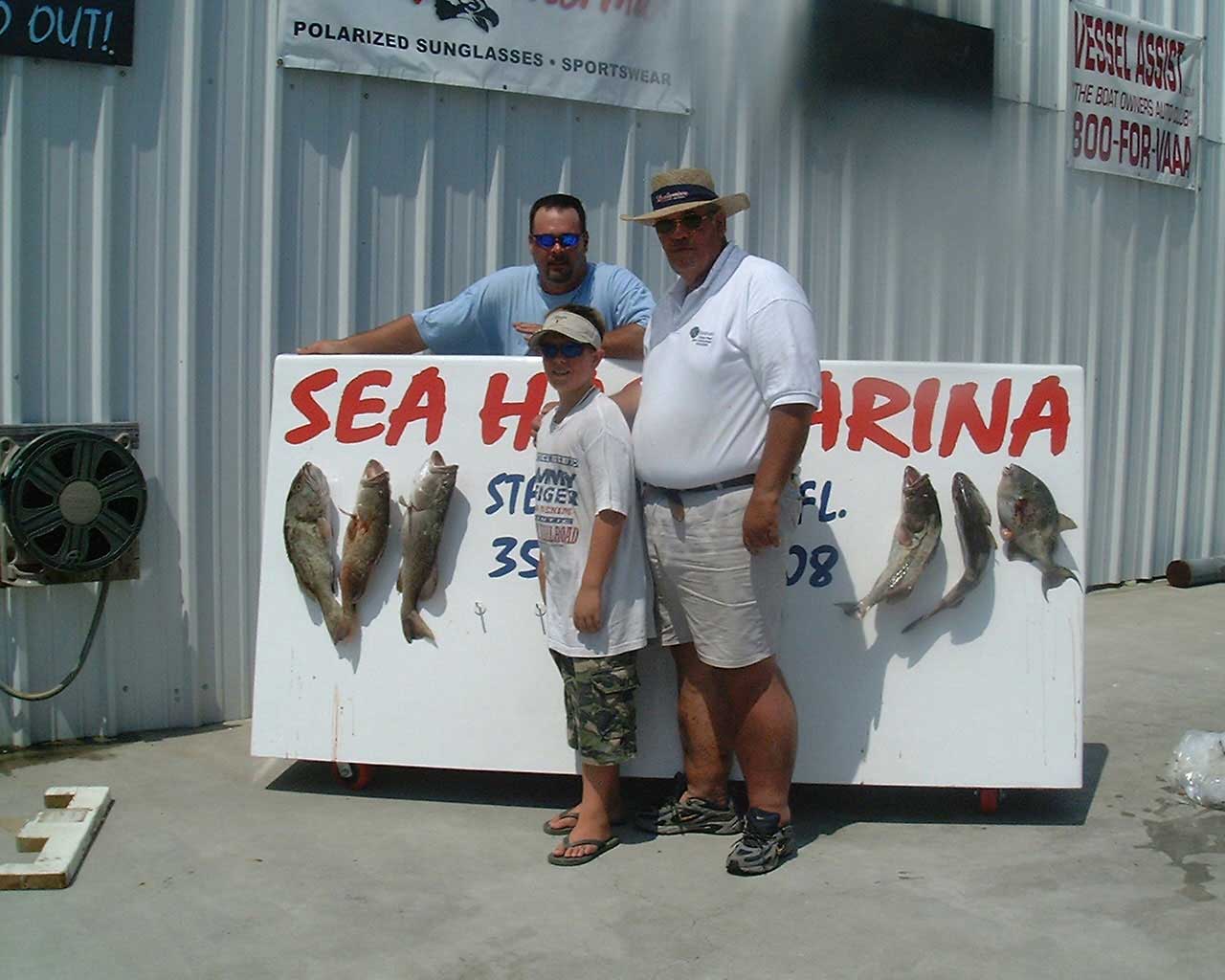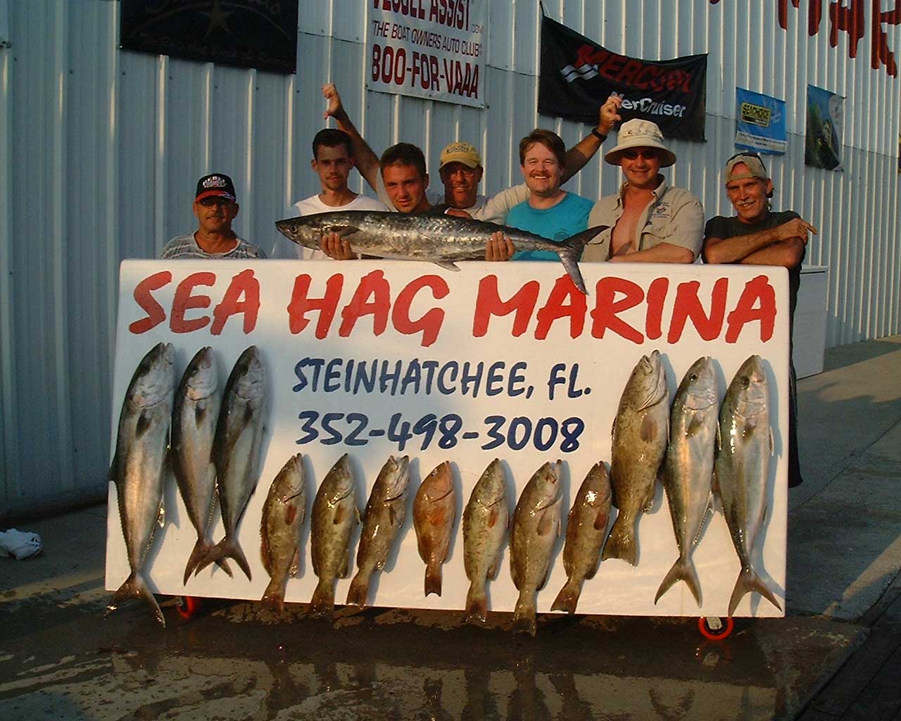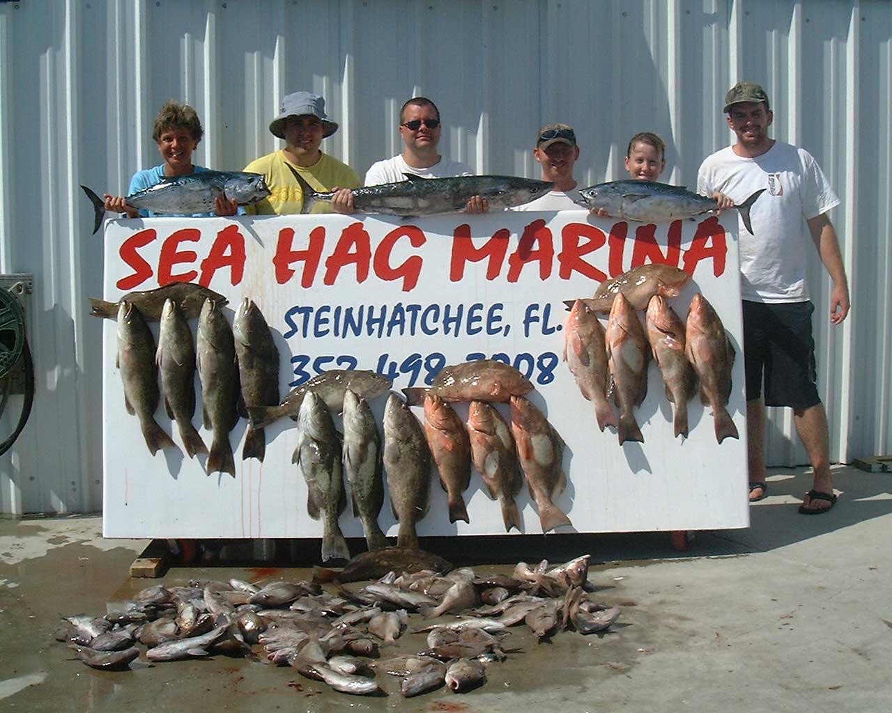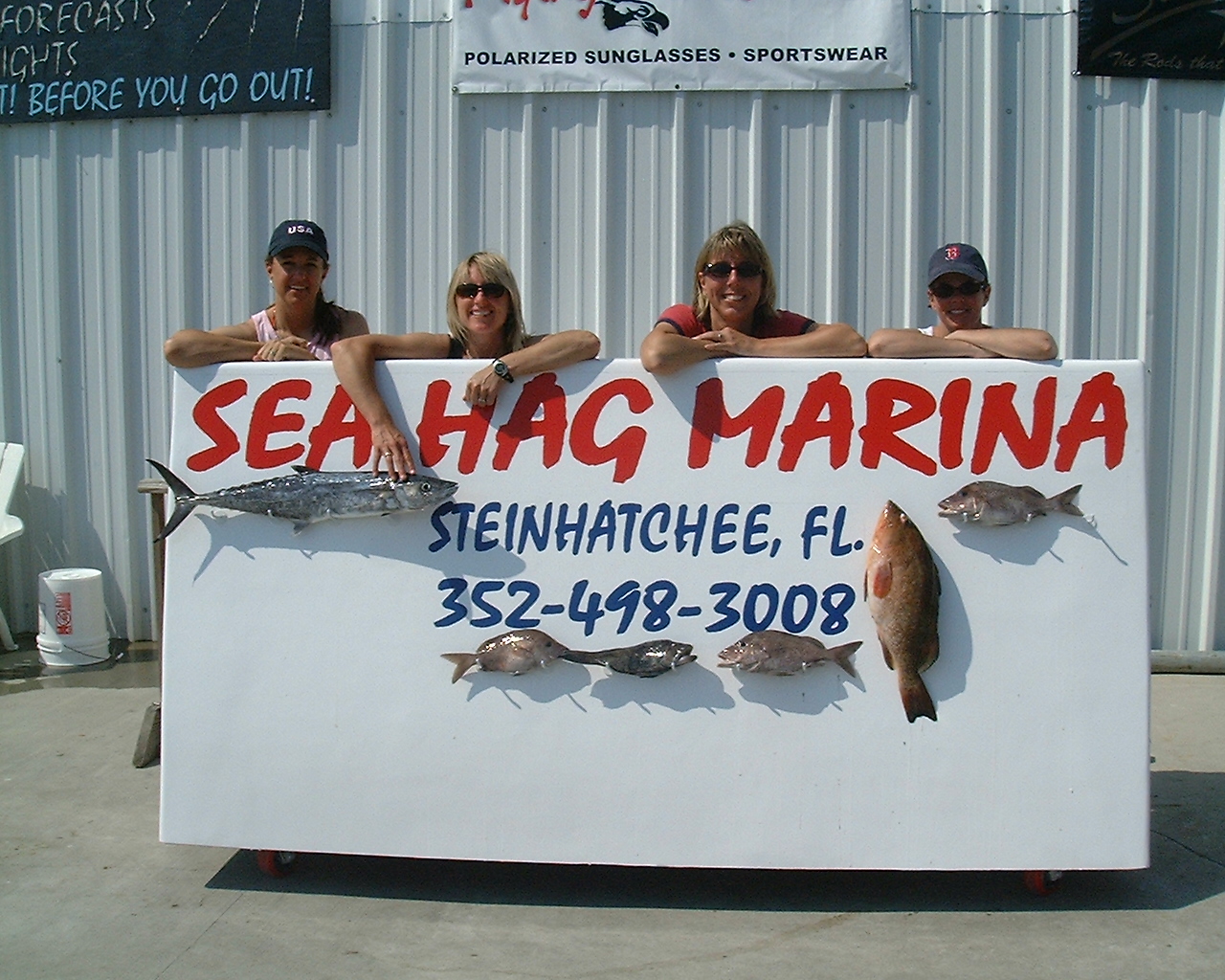 We're back! I'm Captain Rick Walker and it's my turn to try my hand at the fishing reports for a while. Danielle has filled my jump drive with pictures she has taken over the past year so I'll get some presented with this post. Sorry I won't be able to match names with the pictures (unless you email them to me). Captain Walt Carlson reports that some are having good luck catching and releasing sea trout. Many trout over 24" are being caught and released. As you know; next week you can keep them again! Trout are being caught using live shrimp and still others are using lead head & plastic tails along with some suspending lures. I am also getting reports of a few Sheepshead being caught on the Steinhatchee Reef. Although grouper have slowed down; with the water temperature offshore in the 58-60 degree range, good catches are still coming in. I took Garrett, Melvin, Derek (Sea Hag Marina Employees) and their guest on a "thanks for the great job you do" trip Monday the 21st. We fished on "Miss Chaeli" our Sea Hag Charter boat. Seas were 5 to 7 foot well offshore with an occasional light rain. First stop was at the Springs for some great Amberjack action. Our next destination was 6 miles away to find some new numbers while trolling. We picked up 3 nice grouper in the 12 pound range using Stretch 30's and came back with some new numbers. Lots of short grouper, Florida snapper and black sea bass were caught bottom fishing. Everyone had a great time and we were back at the dock at 5:00. See the picture below/right for some of the catch. You can e-mail me with your tips, comments and questions at askcaptain@seahag.com .Take a kid fishing and hope to see you on the water soon. Capt. Rick